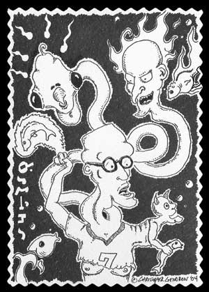 "Dreaming With The Fishes" ( Taken from a poster promoting the play of the same name on planet Grej ) From the "Alien Mini-Trips" series 4" x 6" pen on notched postcard paper usd $100 Contact me for more purchase info