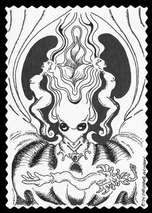 "Krrzthrawl The Great Illusionist " ( Taken from poster promoting this wonderful illusionist from planet Hyot7 ) From the "Alien Mini-Trips" series 4" x 6" pen on notched postcard paper usd $100 Contact me for more purchase info