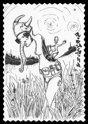 "Leaving Lygrahza" ( Near exact copy of postcards given away at a Colytra shop in Lygrahza ) From the "Alien Mini-Trips" series 4" x 6" pen on notched postcard paper usd $100 Contact me for more purchase info