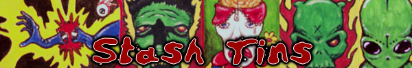 STASH TINS!! - Great for lots of small stuff. These are the same tins that those breath mints come in. Once the mints magically disappear I put a gesso over the area to be painted. Next I paint the design with acrylic paints, followed by two coats of glossy varnish to give it a nice shine and protect the paint. What's that spell? A cool little stash tin with an original design, all for you, or as a gift! Each one is original. If you see one you like BUY IT NOW!!!